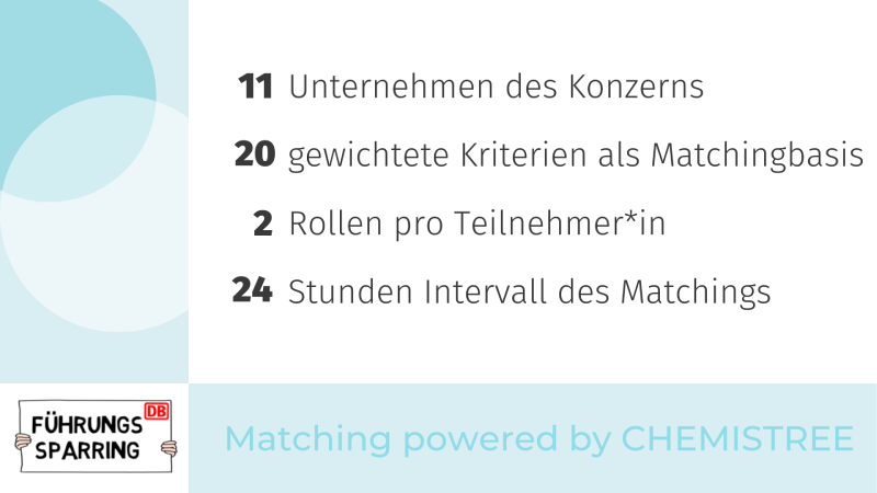 Per algorithmenbasiertem Matching erhalten Führungskräfte für ihre jeweiligen Anliegen eine*n passende*n Sparringspartner*in zur Seite gestellt: blitzschnell (gematcht wird über Nacht) und individuell. Dabei kann jede Führungskraft gleichzeitig Fallgeber*in und/oder Sparringspartner*in sein. Über die beteiligten 11 DB Unternehmen hinweg ermöglicht das Sparring einen direkten, bedarfsabhängigen und kurzfristigen Austausch zu Herausforderungen im Führungsalltag. Das Angebot wird mit großem Interesse genutzt: Mittlerweile beteiligen sich rund 350 Führungskräfte, über 160 Tandems wurden gebildet. Für öffentliche Aufmerksamkeit und Anerkennung sorgt nun der Gewinn des Deutschen Exzellenz-Preises 2022.